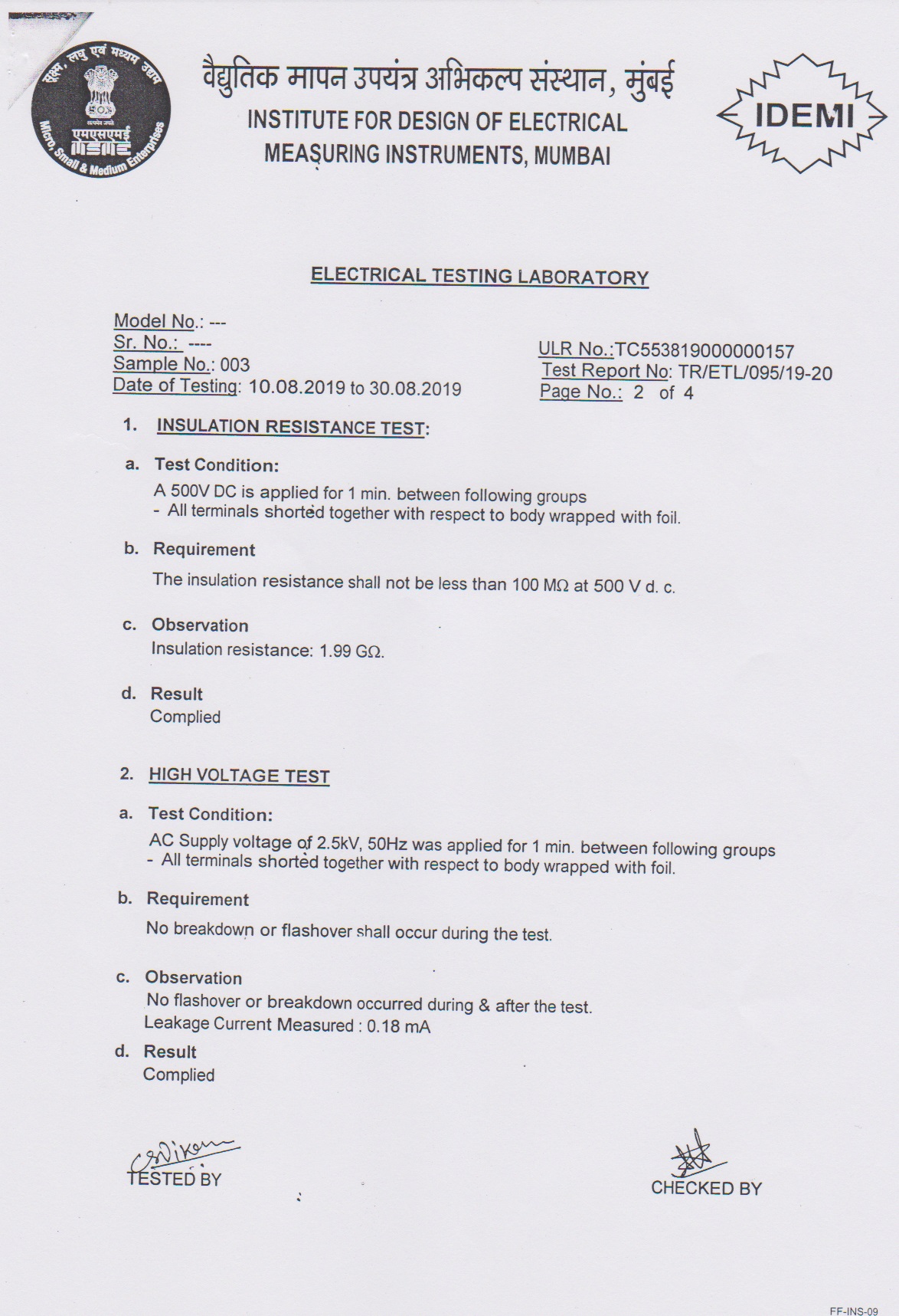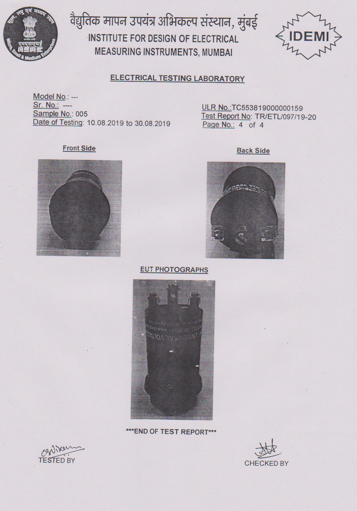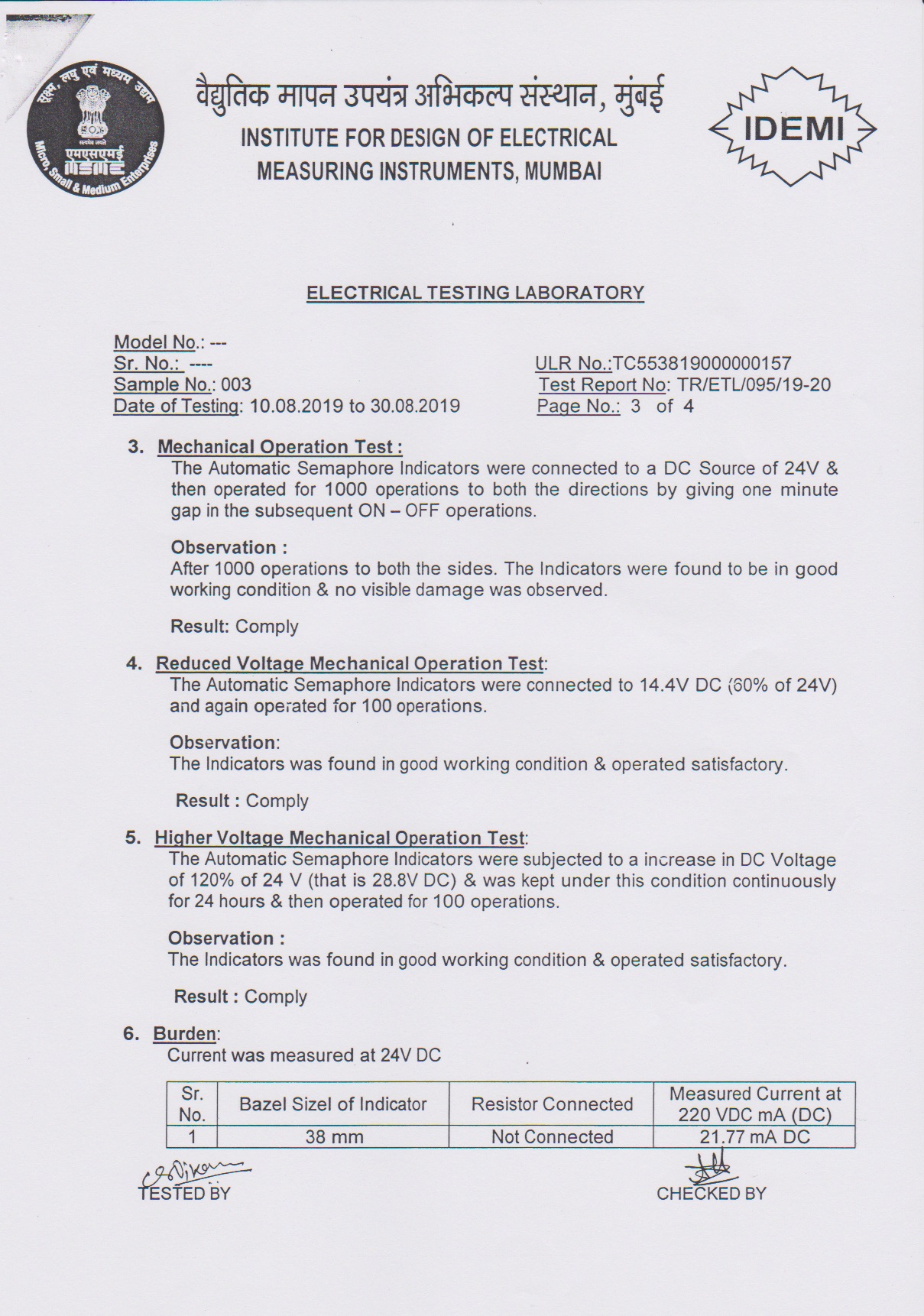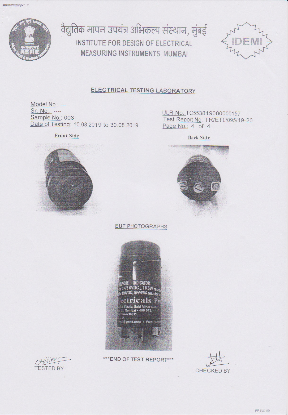 - Type Tested as per IS-3231 - 1965 at IDEMI Bombay.