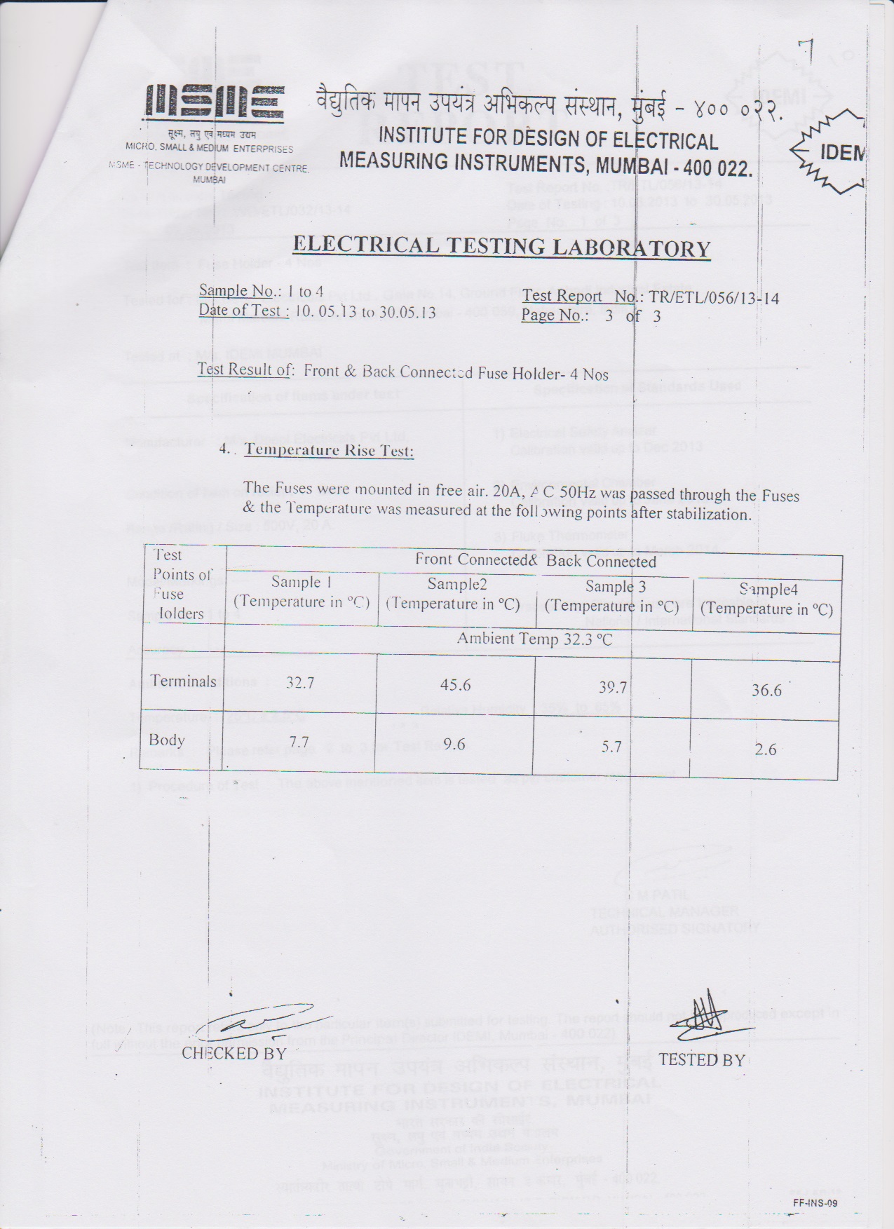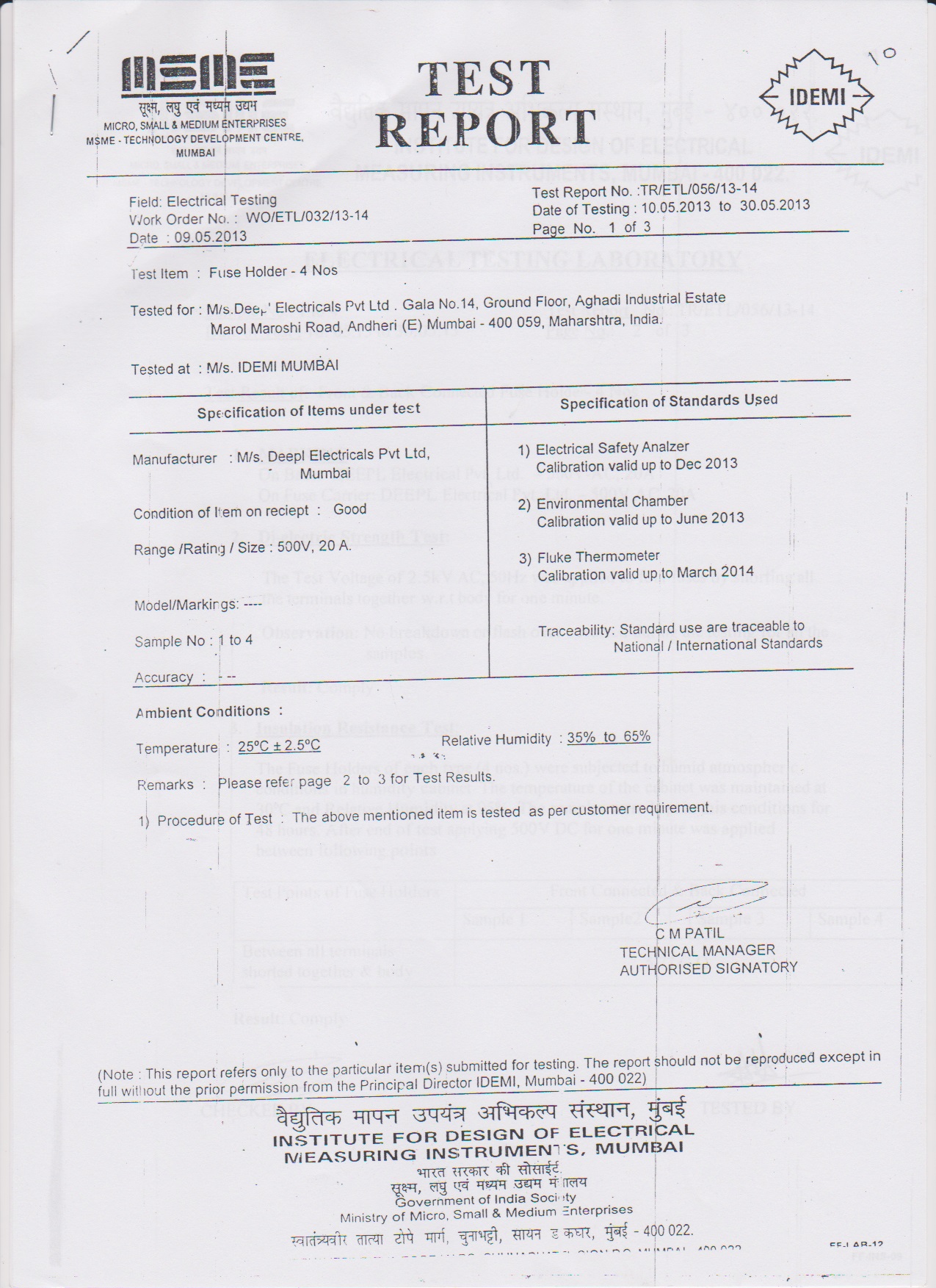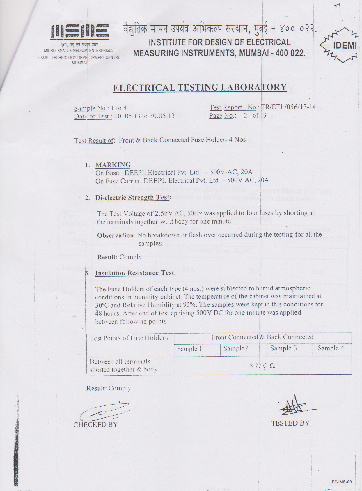 TESTED AS PER IS: 13703 Part I at IDEMI BOMBAY FOR